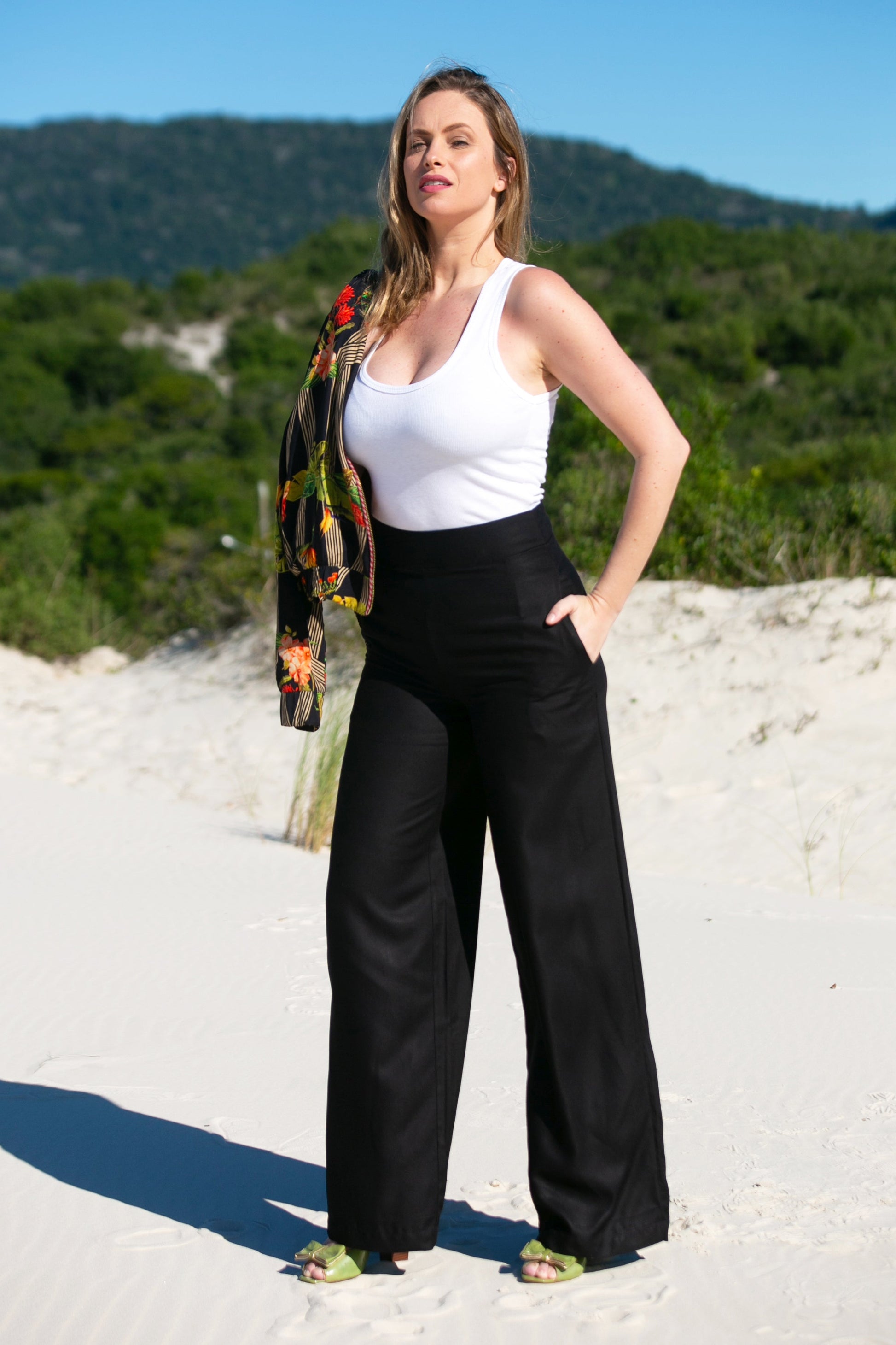 Uma boa Pantalona Preta é uma peça chave pra qualquer guarda roupas. Nossa Pantalona tem uma modelagem fluida, cintura bem marcada e tecido de Viscose encorpado, garantindo um caimento impecável. Disponível nas cores sólidas: preto, azul céu e vinho.